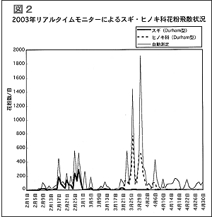 2002年2月から試験的に開始した空中花粉自動測定機(リアルタイムモニター)は前年3月下旬頃から黄砂の影響を大きく受けた可能性があったため、(株)大和製作所からの申し出を受け、2003年2月から黄砂レンジを兼ね備えた機器を設置し、重力法による花粉捕集器と花粉飛散状況を比較検討した。