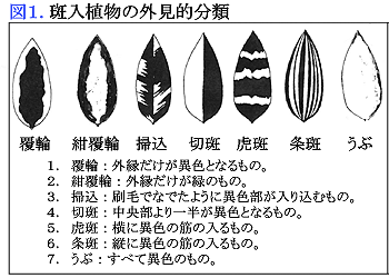 園芸店に行くと多くの斑入植物が売られています。日本人は古くから斑入植物を好み、野生の植物の中から選別し愛培してきました。すでに江戸時代には斑入植物に関する園芸書籍が出版されています。斑入植物は外見的に以下のように分けられます(図1)。